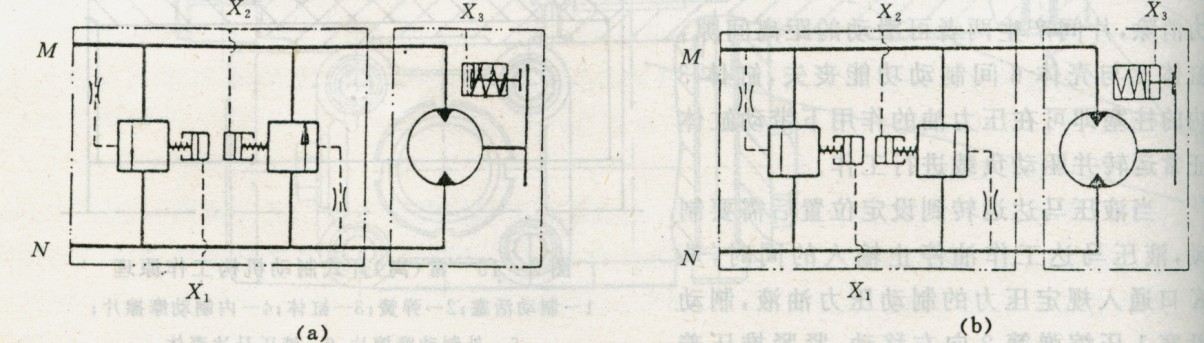 圖3-17(a)為制動(dòng)器常開(kāi)(K)型結(jié)構(gòu),當(dāng)馬達(dá)進(jìn)油口停止供油時(shí),制動(dòng)油從X3進(jìn)入,馬達(dá)即時(shí)被制動(dòng)。圖3-17(b)為制動(dòng)器常閉(B)型結(jié)構(gòu),馬達(dá)進(jìn)油口開(kāi)始通油時(shí),必須從X3口同時(shí)導(dǎo)人壓力油,以松開(kāi)制動(dòng)器,液壓馬達(dá)方始可以轉(zhuǎn)動(dòng)。