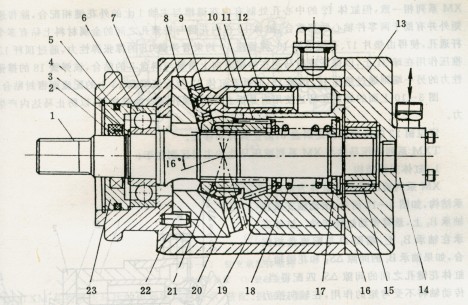 傳動(dòng)輸出軸1伸出端用軸承6固定在殼體7的相應(yīng)孔內(nèi),軸用彈性擋圈3的作用是為了防止軸承6在軸上竄動(dòng),孔用擋圈4限定著擋蓋23,抵在軸承6的外鋼圈上,使得軸1和軸承6的組件不會(huì)在液壓馬達(dá)殼體內(nèi)產(chǎn)生軸向移動(dòng)。密封圈5和旋轉(zhuǎn)油封2可避免液壓油從馬達(dá)體內(nèi)泄漏至外。