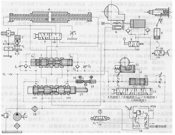 1一換向閥2-百鎖缸3-開(kāi)停閥4-工作臺(tái)液址缸5-節(jié)流聞6閘缸7快動(dòng)缸8-快動(dòng)閥9尾架缸IO-尾架閥11-進(jìn)給缸12-進(jìn)給閣13-選擇閥14潤(rùn)滑穩(wěn)定器15-抖動(dòng)缸 16捎塊17先導(dǎo)閥I8精過(guò)濾器