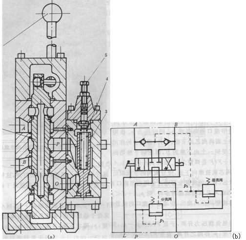 1-操縱手柄;2-主閥閥芯}3-分流閥;4-彈簧;5-調(diào)節(jié)螺釘