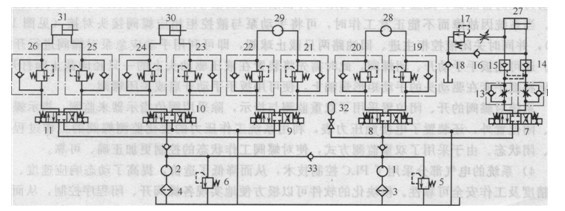 1、2-液壓泵;3、4-過濾器;5、6-溢流閥;7~11電液比例閥;12、13節(jié)流閥; 14、15 -液控單向閥;16、18、33-單向閥;17 -溢流閥;19~26-平衡閥;27-補償液壓缸;28回轉(zhuǎn)液壓馬達;29-起升絞車液壓馬達;30-主臂液壓缸;31-副臂液壓缸;32-蓄能器